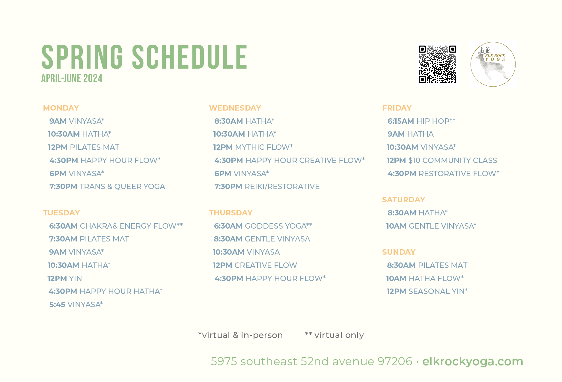 Elk Rock Yoga is a neighborhood yoga studio in Portland, Oregon offering daily classes and seasonal workshops. They wanted a professional way to share their schedule beyond social posts, something students could easily keep and reference.
